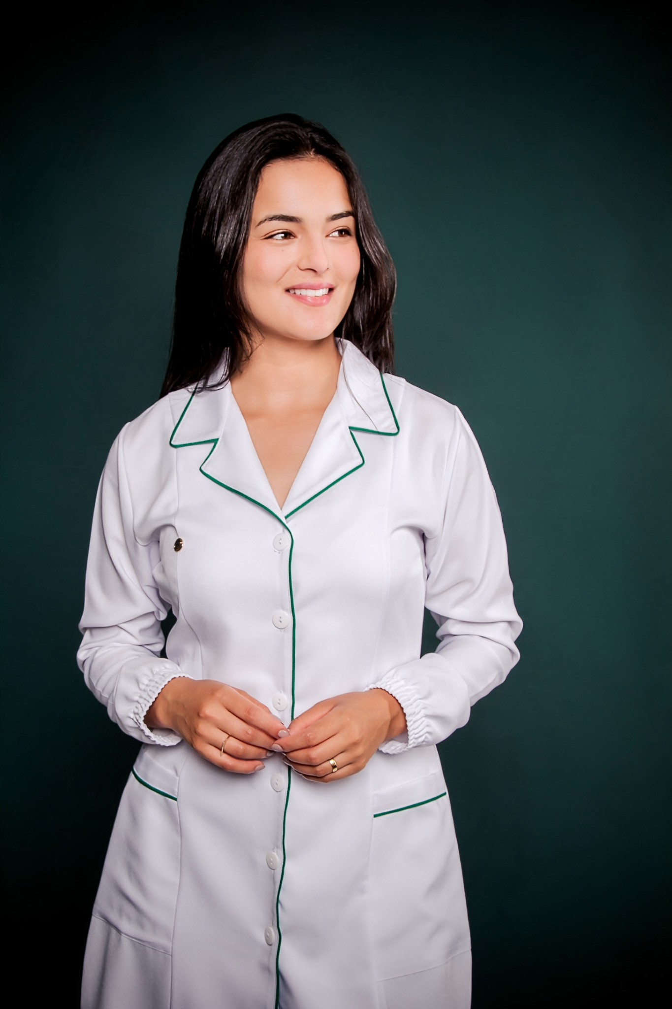Com detalhes coloridos na gola, punho e cinto, com mangas longas, com punho de elástico, tem recortes e dois bolsos na frente, fechamento frontal com com botões imbutido, na parte de traz possui pences e um cinto na altura da cintura.