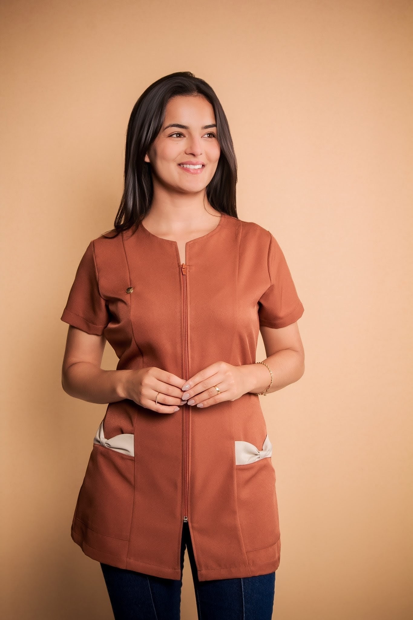 Prepare-se para o verão em grande estilo com o jaleco Maju! Com decote redondo, mangas curtas e dois bolsos frontais com detalhes em laço, zíper na frente, este jaleco é perfeito para manter o frescor e o visual moderno. A parte de trás apresenta pences e um cinto em forma de laço na altura da cintura. Com seu tecido leve e respirável, você pode ficar confortável enquanto procura o seu melhor no jaleco Maju.