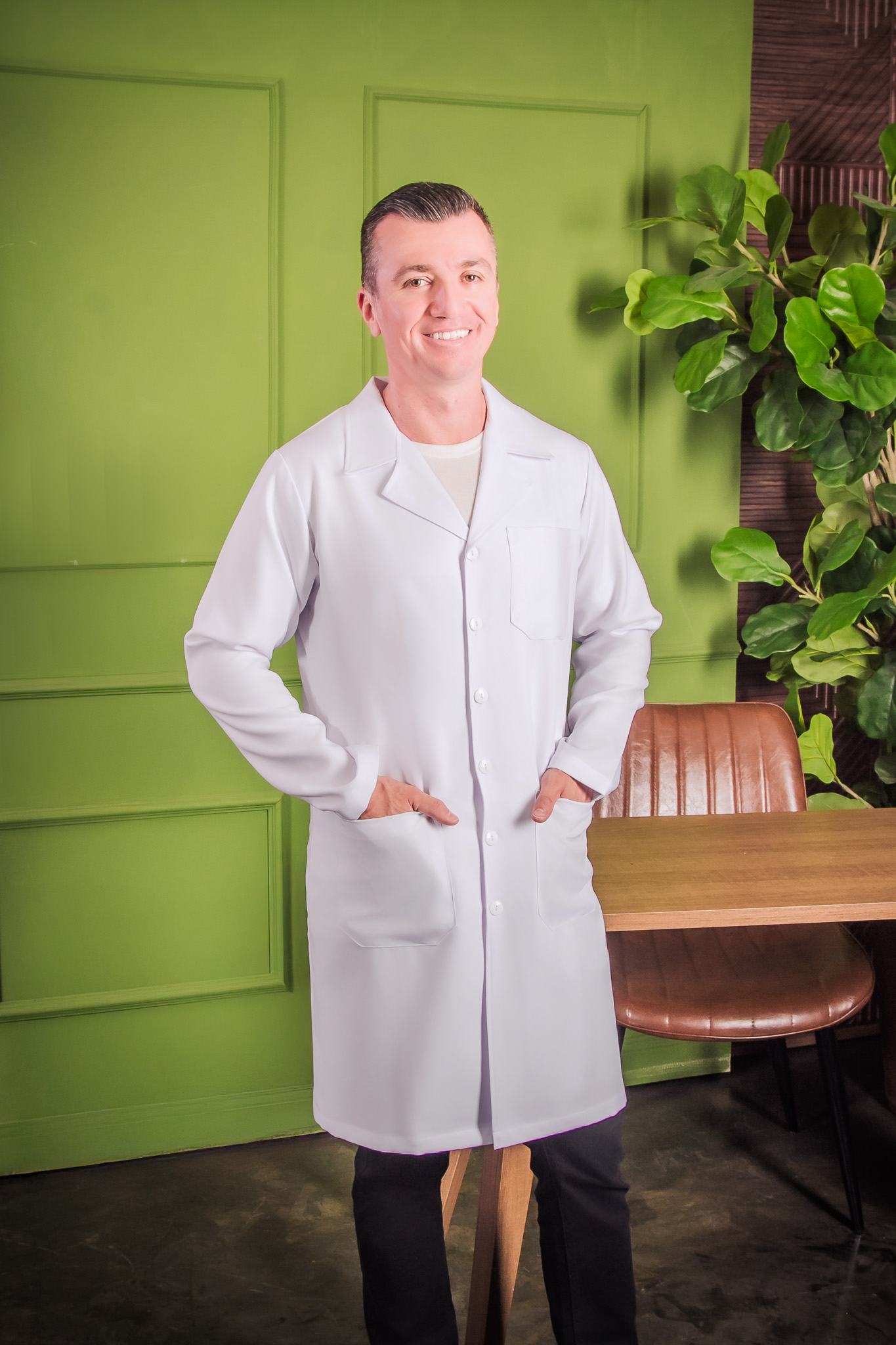 Com gola tradicional de jaleco com toque moderno, mangas longas lisas, dois bolsos na frente, fechamento frontal com botões, na parte de traz possui um cinto na altura da cintura.