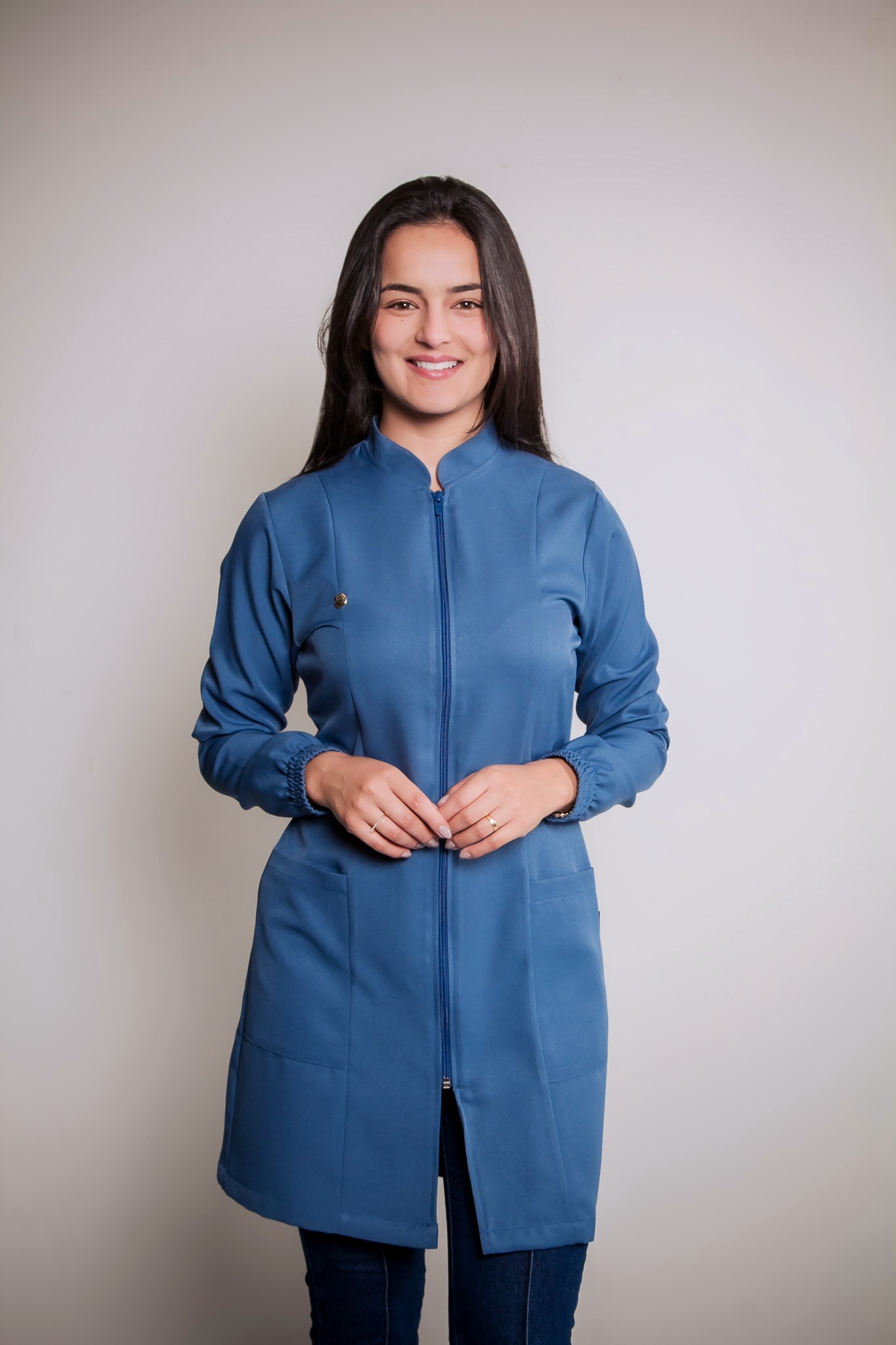 Com gola padre, mangas longas e punhos com elástico, tem recortes e dois bolsos na frente, fechamento frontal com zíper, na parte de traz possui pences e um cinto na altura da cintura. Modelo ideal para ser personalizada para universitários.