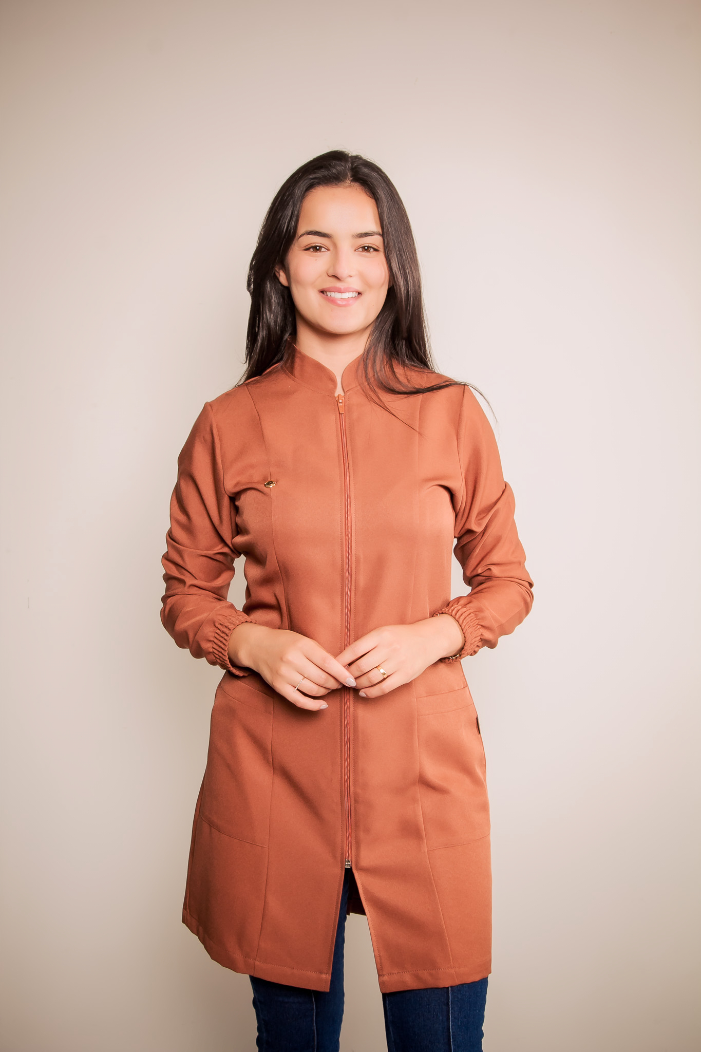 Com gola padre, mangas longas e punhos com elástico, tem recortes e dois bolsos na frente, fechamento frontal com zíper, na parte de traz possui pences e um cinto na altura da cintura. Modelo ideal para ser personalizada para universitários.