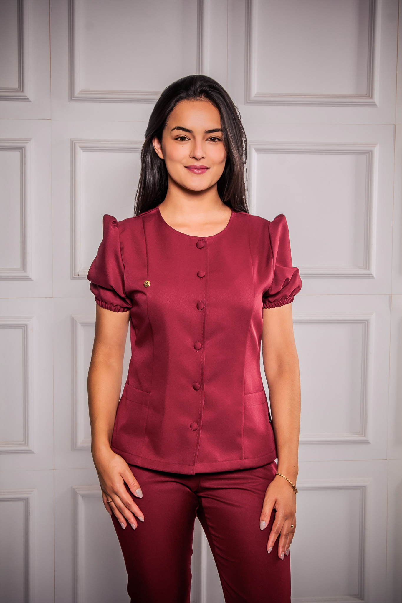 Blusa com decote redondo, mangas curtas bufantes com elástico no punho, tem recortes e bolsos na frente, fechamento com botões encapados, na parte de traz possui pences.
